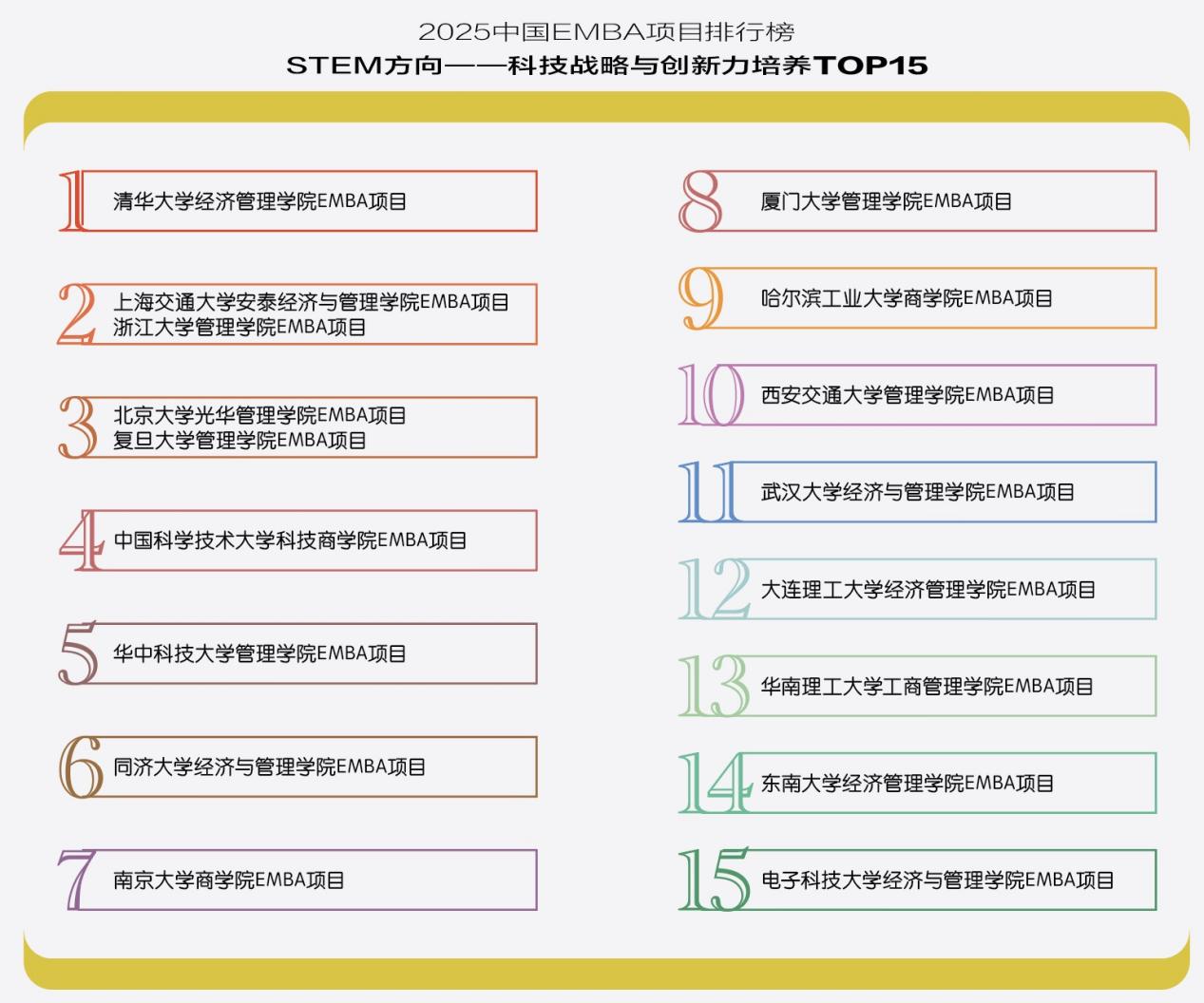 11月11日,《经理人》杂志发布“第十四届中国EMBA项目排行榜”“中国港/澳区域的影响力中文EMBA项目”暨“STEM:EMBA商学教育与培养的新挑战”报告。中国科学技术大学EMBA项目以总分153.95位列“2025年度中国EMBA项目排行”主榜第四,较2024年排名再获提升;在“理工类大学EMBA项目排行榜”中,学院EMBA项目位列第一,“STEM方向-科技战略与创新力TOP15”中位列第四。此外,科技商学院院长(名誉院长)宋志平《经营方略》、执行院长叶强《数字经济与企业化数字转型》以及科技商学院讲席教授、美国国际工程院院士张捷《美国高科技企业管理》三项科创EMBA课程获评“值得推荐的EMBA项目50门课程”。